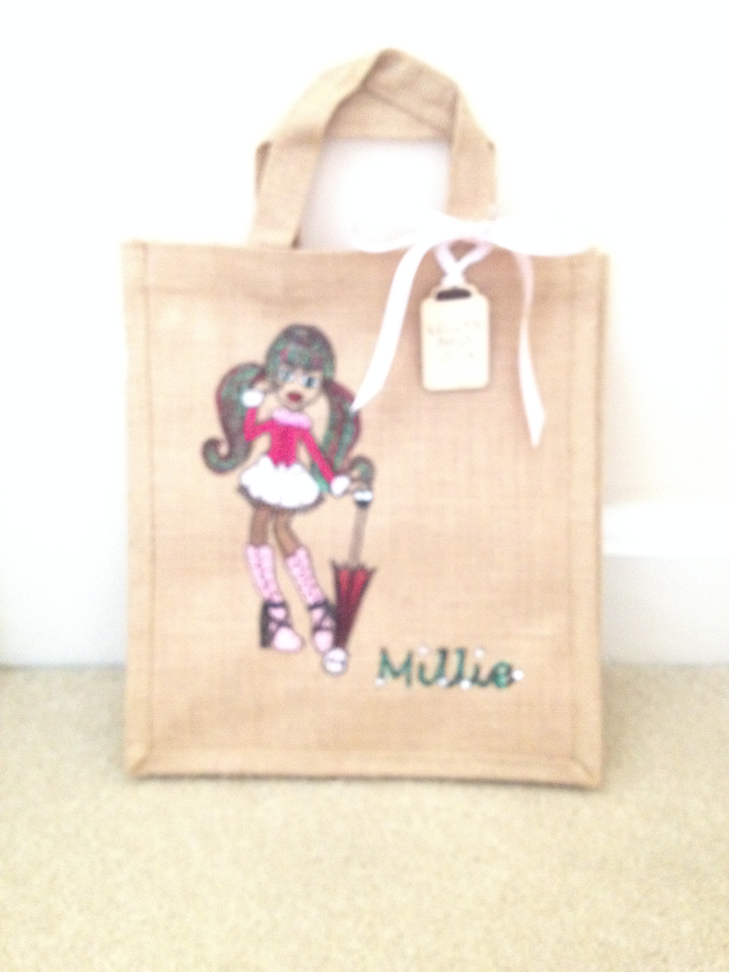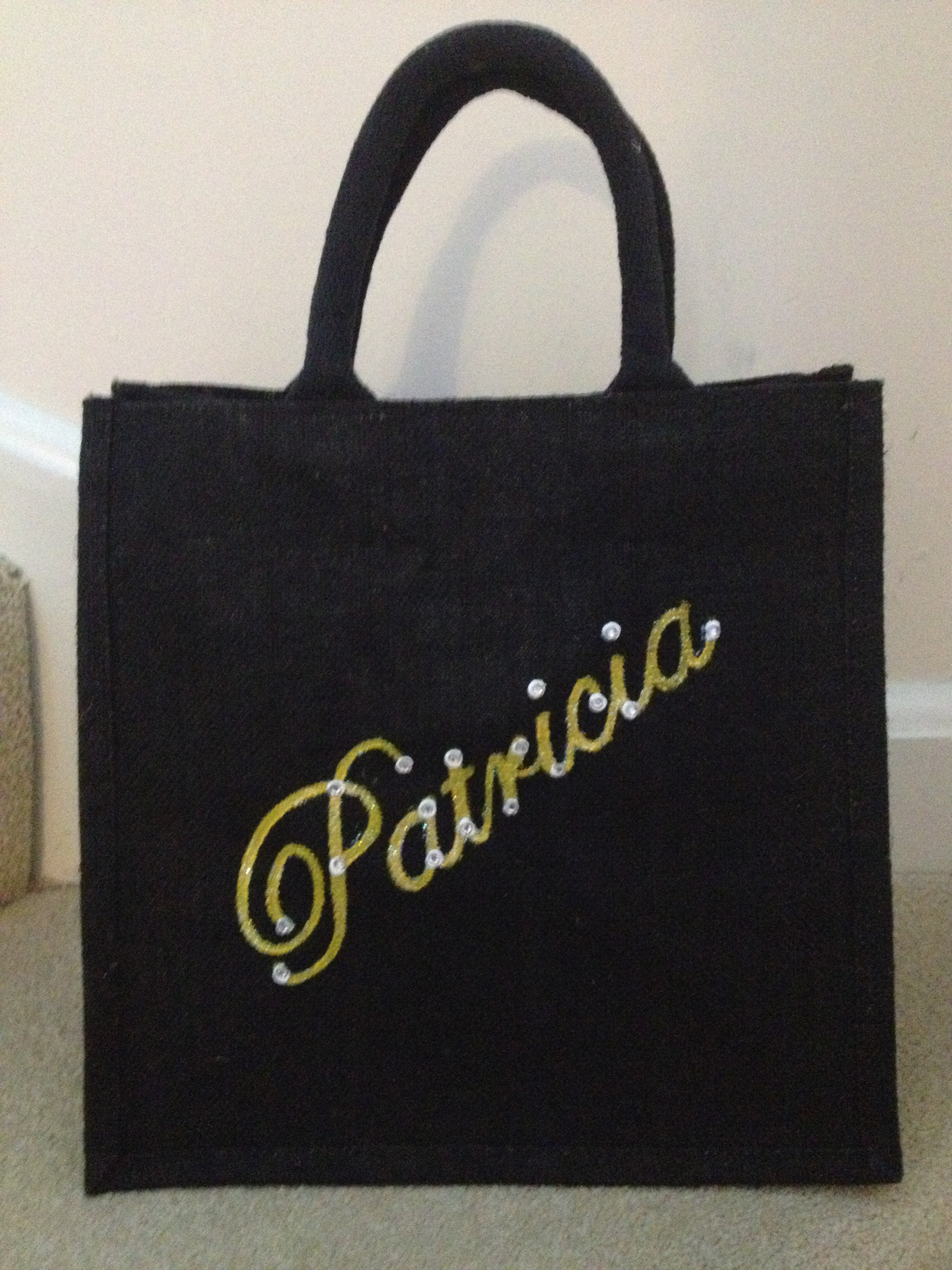 Our personalized name jute bags are also one of our best seller. These are natural or black Jute bags and come with your name, or initial hand-painted on, in a variety of colours complete with bling and sparkle.